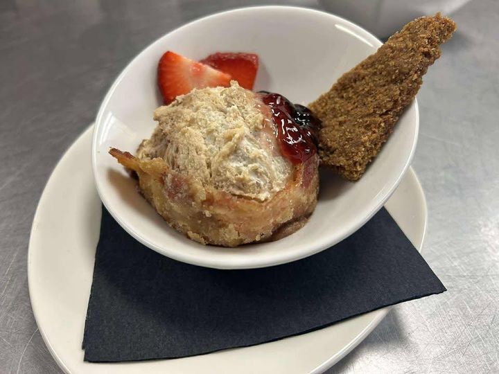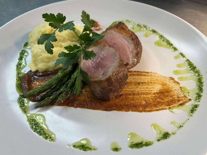 CUMIN AND ROSEMARY CRUSTED DUCK WITH MAPLE ANCHO GLAZE, GOUDA MASH, ASPARAGUS$30.00
