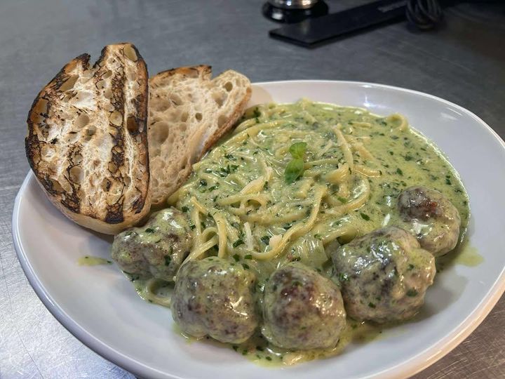 HOUSE MEATBALLS IN A CREAMY BASIL PESTO SAUCE OVER LINGUINNI$17.00