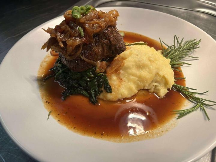 SEARED BEEF, CARMELIZED ONION, ROASTED TOMATO, BALSALMIC DEMI GLAZE, FONDANT POTATOES AND SPINACH$50.00