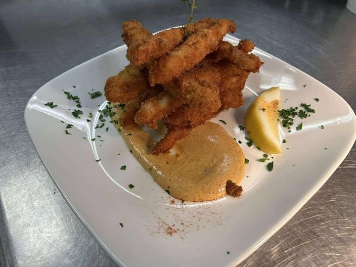 CRISPY FRIED CALAMARI BATTONS WITH ROASTED GARLIC REMOULADE$13.00