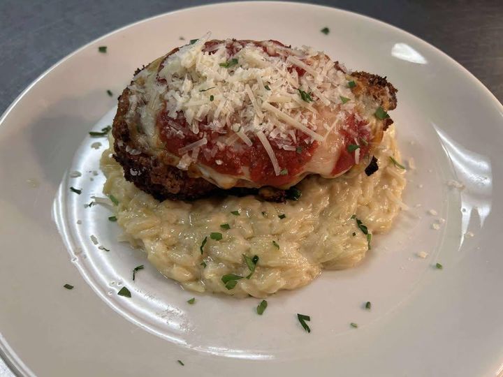 CLASSIC CHICKEN PARMESAN WTH CREAMY ORZO PASTA AND SPINACH$20.00