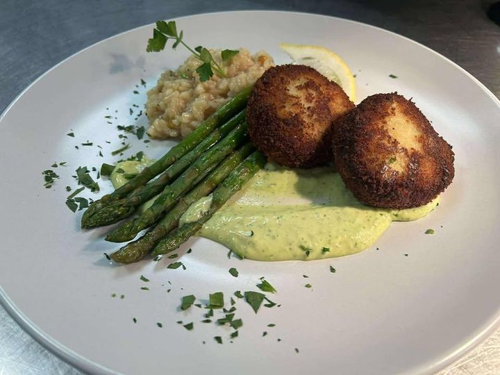 TWO FRIED CAKES, PESTO AIOLI, GARLIC AND PEPPER RISOTTO AND ASPARAGUS$38.00